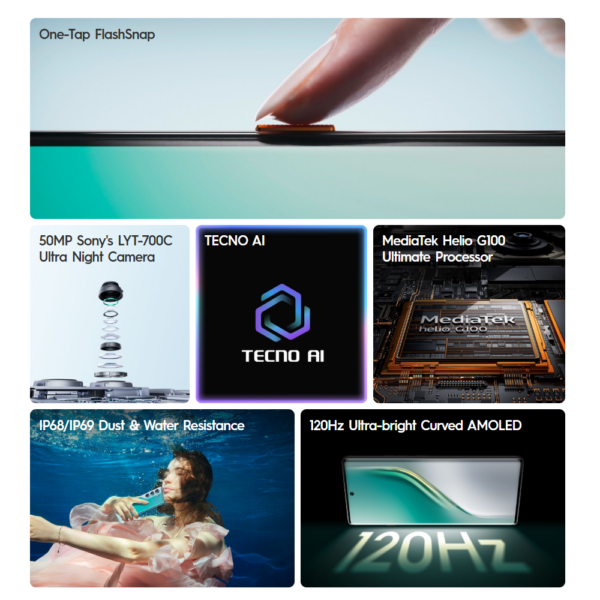 Tecno Camon 30 5G 12GB/512GB (100MP OIS Camera, 50MP Auto Focus Selfie, 6.78-inch AMOLED Display, Dimensity 7020, 5000mAh and 33W Charger)